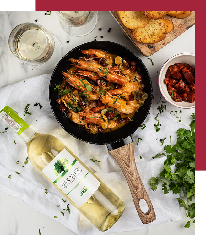 Krewetki w sosie winno maślanym z chorizo, kolendrą i grzankami