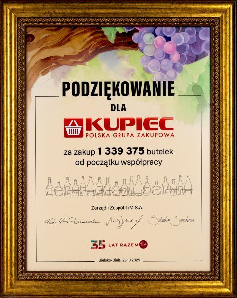 Z okazji 35-lecia Spółki TiM Ewa Krzuś-Wiśniewska, Prezes Zarządu oraz Maciej Jurczyk, Wiceprezes Zarządu wręczyli PGZ Kupiec podziękowanie za zakup 1 339 375 butelek od początku współpracy.